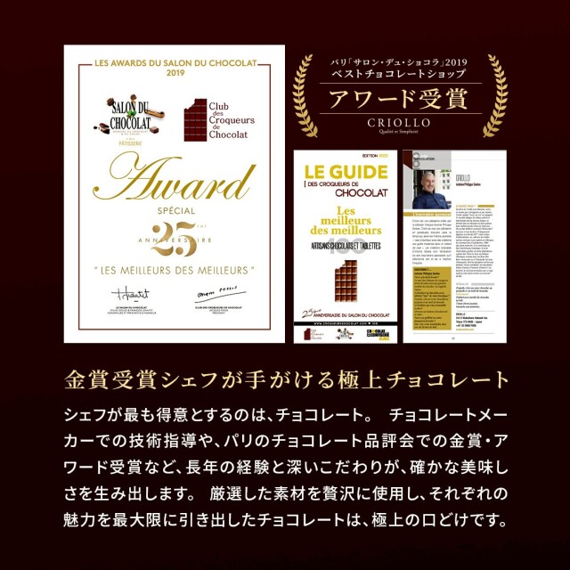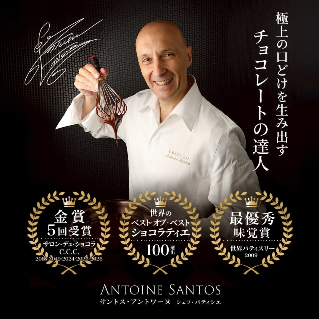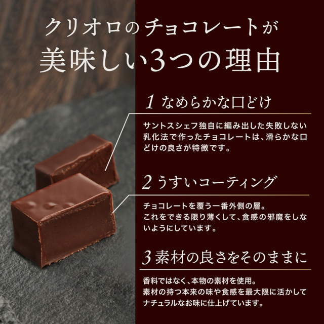 フランス高級チョコレートメーカー「ヴァローナ社」で技術指導を行っていたサントスシェフが作るチョコレートは、コーティングが薄く、中のガナッシュは口どけが滑らかなのが特徴です。香料ではなく本物の素材を使用したこだわりのチョコレートは、贈り物にも最適です。