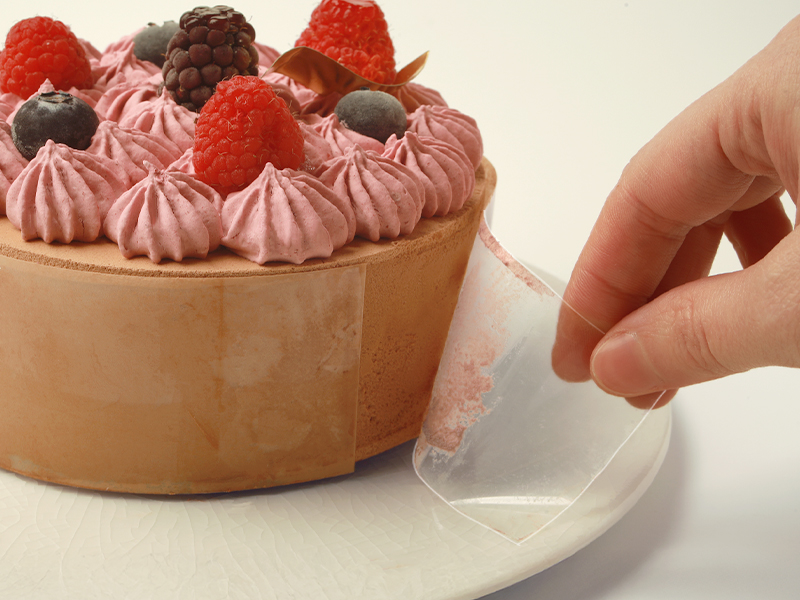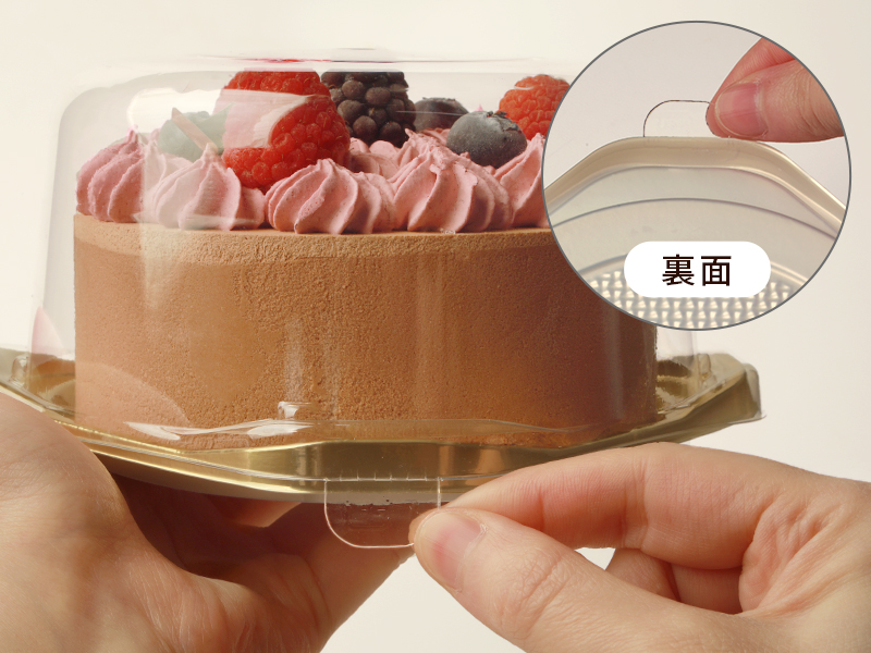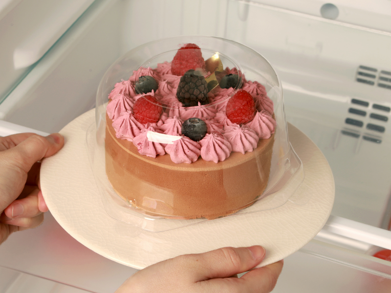 お皿の上のケーキに透明カバーをのせて、冷蔵庫で所定の時間解凍してください。