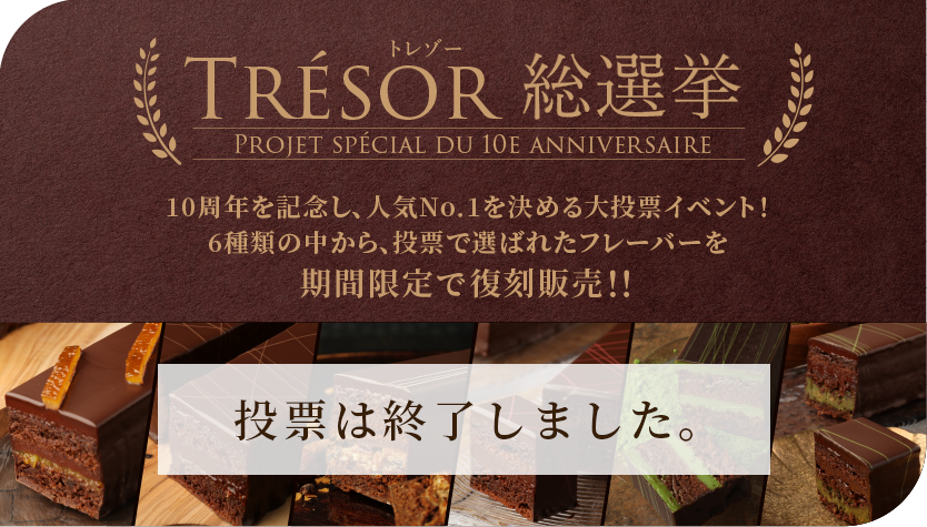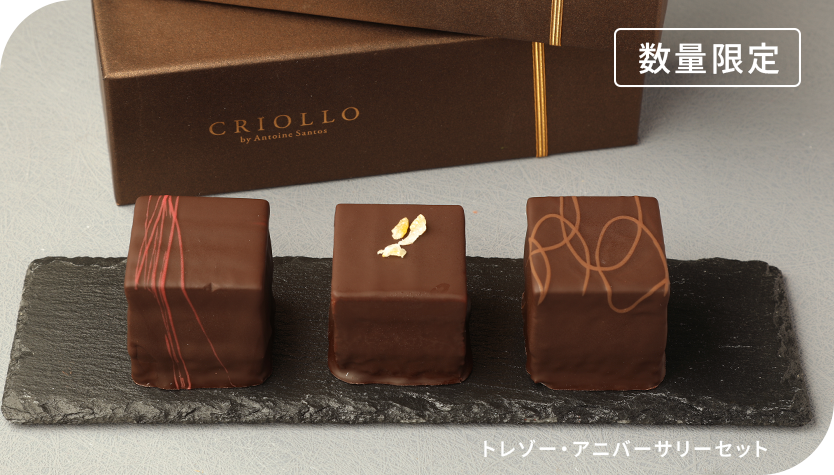 10周年を記念して、これまで登場した中から選りすぐりの3種類を新宿伊勢丹サロン・デュ・ショコラ限定で販売します。トレゾー・フィグカシス、トレゾー・ゆず、トレゾー・プラリネの3種詰め合わせ。