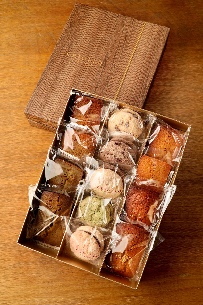 クリオロの人気焼き菓子、フィナンシェの詰め合わせ12個セット。プレーン、キャラメル、アールグレイ、ピスタチオの4種類の味が楽しめます。